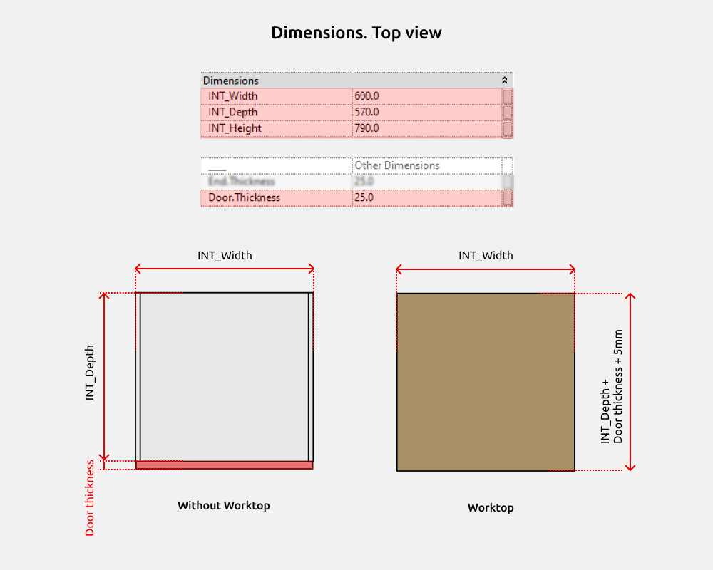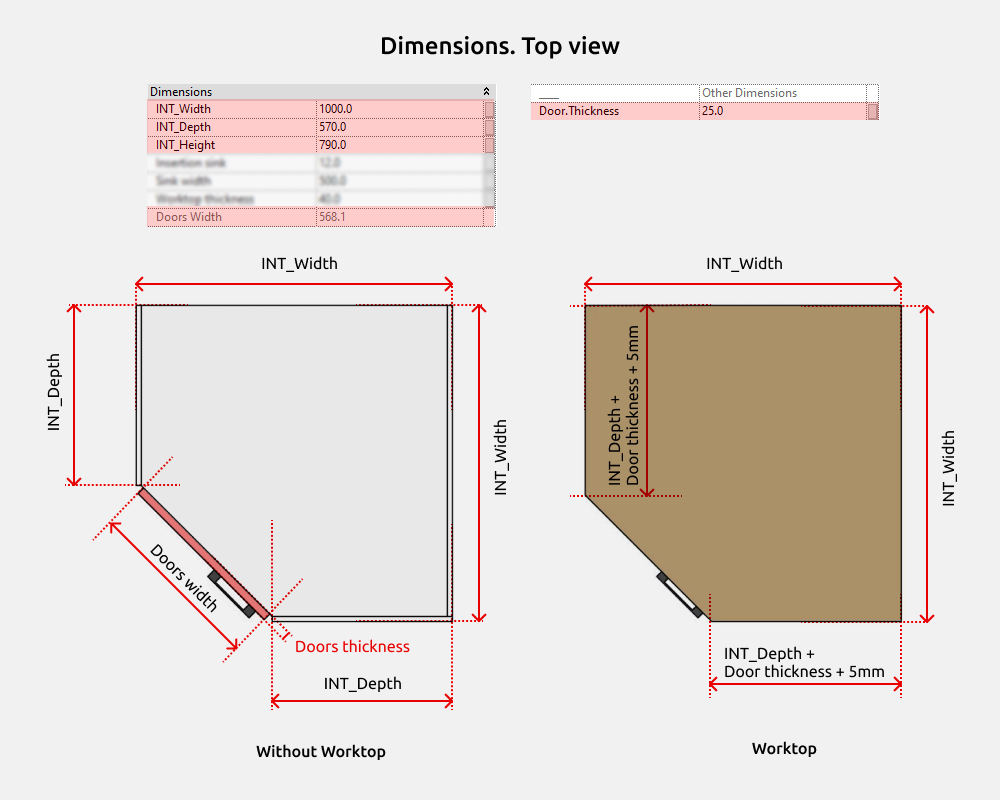 Worktop depth in the top view has a fixed value and consists of the dimensions: Depth + Door thickness + 5mm.