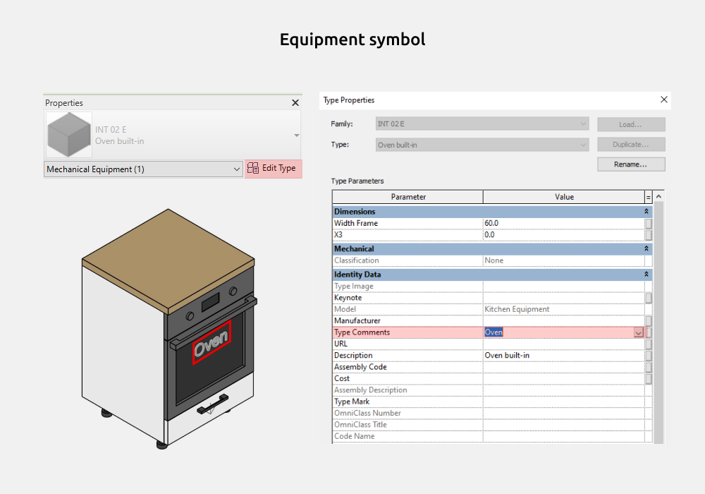 To change the text symbol of equipment, you need to select the equipment in the unit using the Tab key and click Edit Type, then Type Comments.