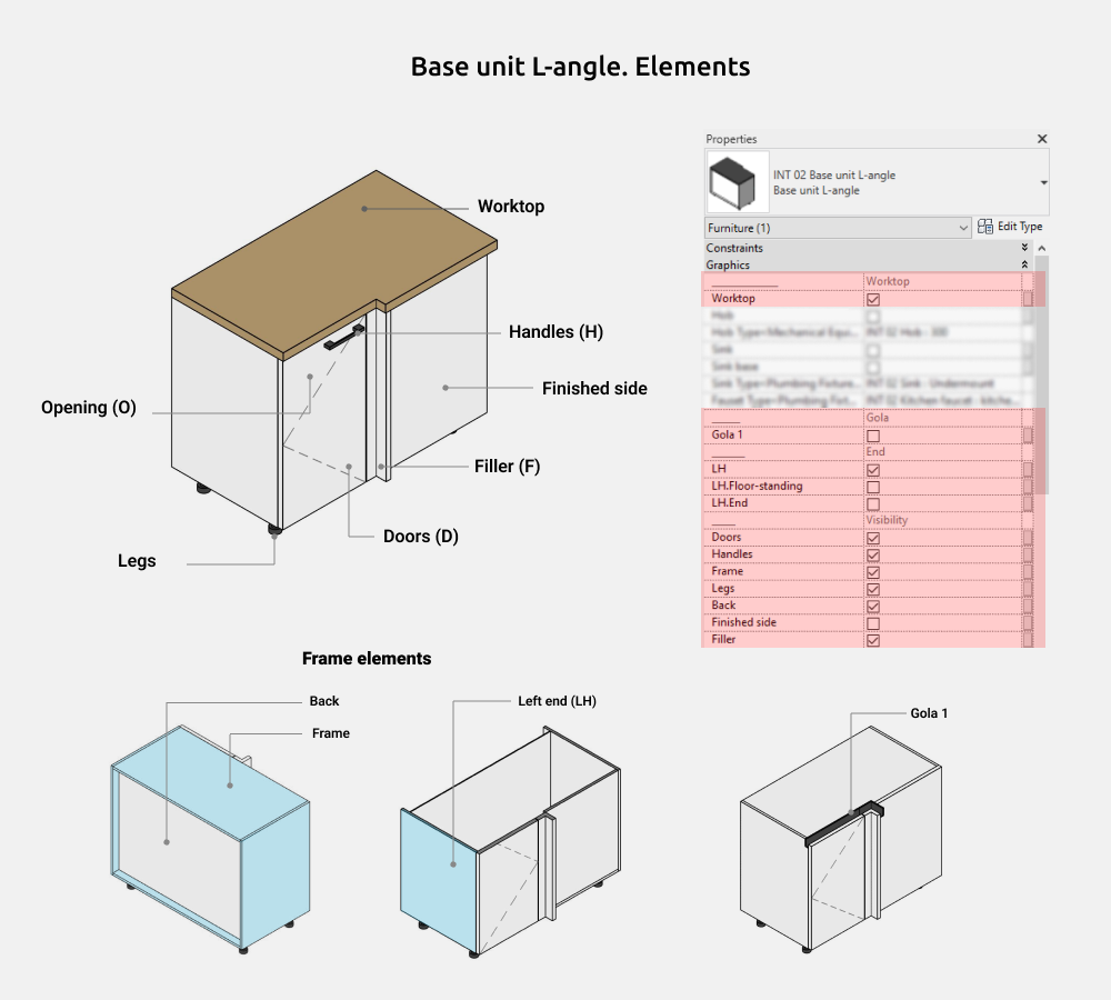 Base unit L-angle is used to build corner kitchen cabinets, which are placed on the floor and serve as a work surface for cooking. Unlike the Base unit, there is no equipment in the doors, and the number of doors is only 1.