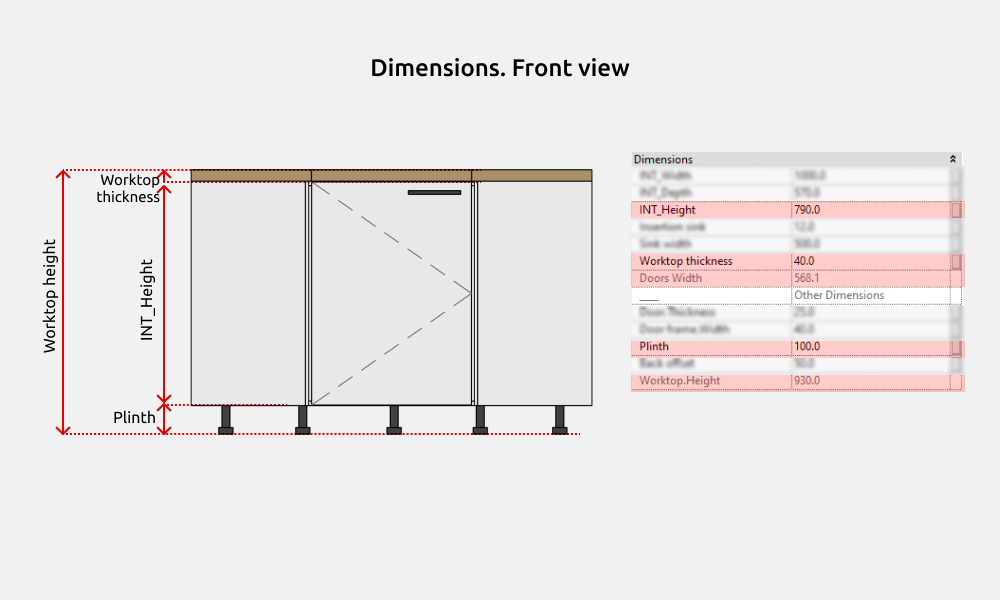 There are gray parameters that cannot be controlled. But they are needed to understand the size calculations. For example, Worktop height. The parameter summarizes all heights and shows the important end point of the worktop when Worktop is enabled. (see pictures)