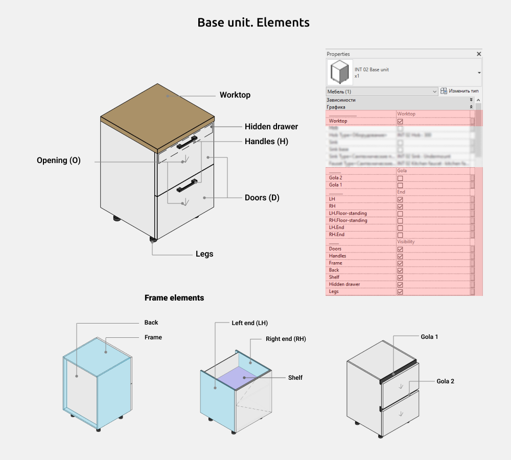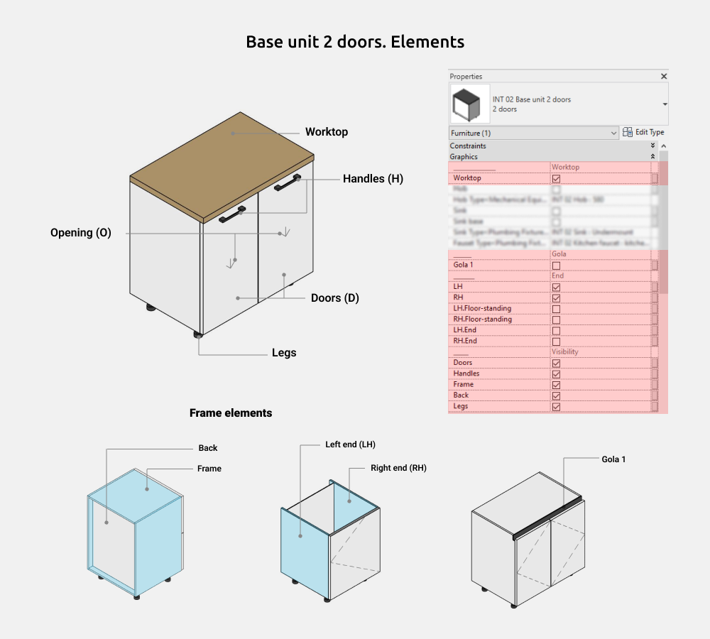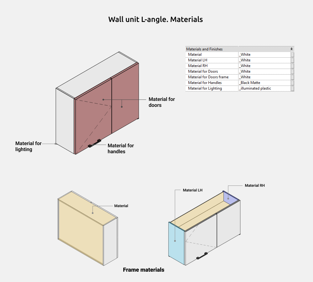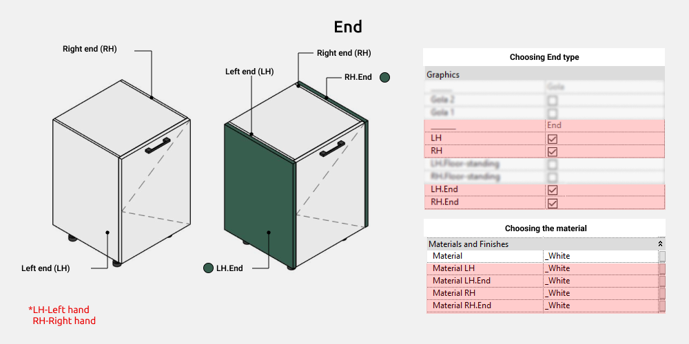In units that are installed on the floor, additional parameters are added to the ends. These are: LH.Floor-standing, RH.Floor-standing (which allows the ends to be lowered to the floor) and LH.End, RH.End.