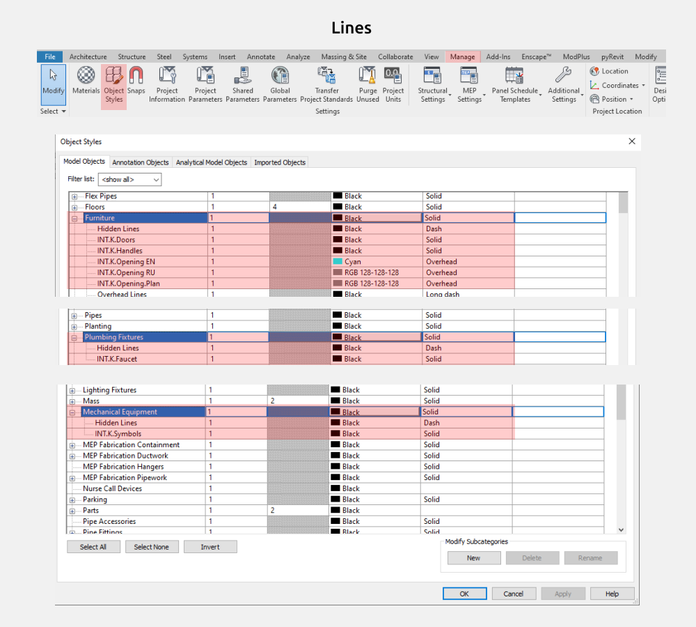 To change the color/weight/pattern of family lines, you need to go to Manage - Object Styles - Furniture/ Plumbing Fixtures/ Mechanical Equipment