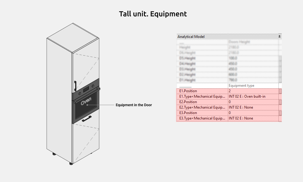 By default, the equipment has the door height in which it is installed. But if you need to change the dimensions, then put the number 0 in the E.Position parameter and the equipment is freely placed as needed for a specific case. To do this, change E.Base and E.Height.