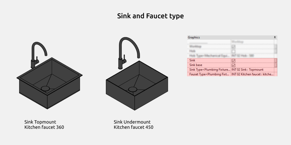 Be sure to choose types with the initial heading INT 02 Sink. Because various other families are loaded into the drop-down lists and do not need to be selected.