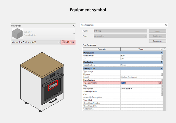To change the text symbol of equipment, you need to select the equipment in the unit using the Tab key and click Edit Type, then Type Comments.