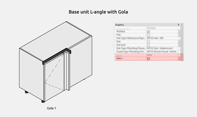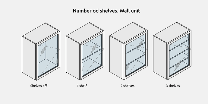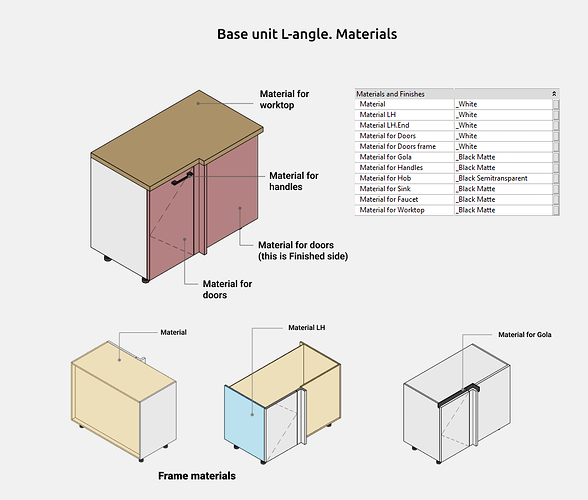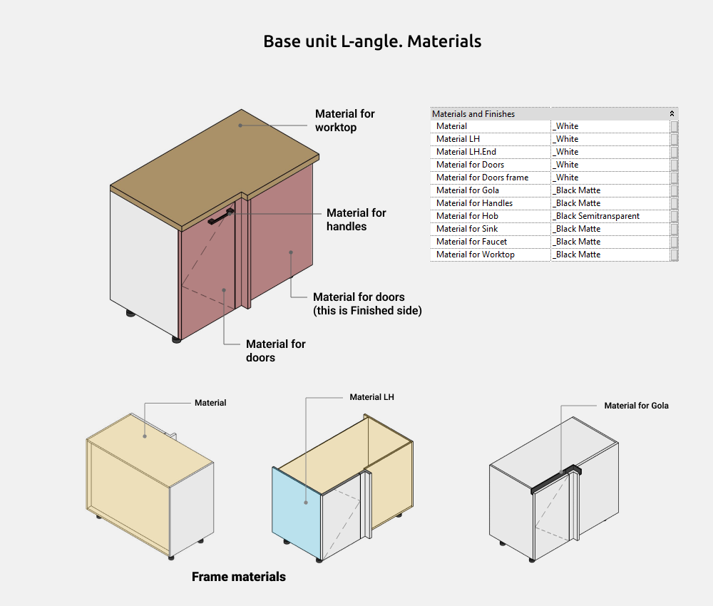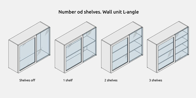 Base unit L-angle is used to build corner kitchen cabinets, which are placed on the floor and serve as a work surface for cooking. Unlike the Base unit, there is no equipment in the doors, and the number of doors is only 1.