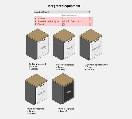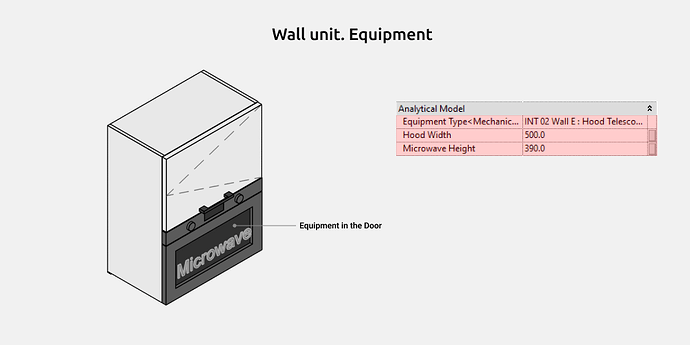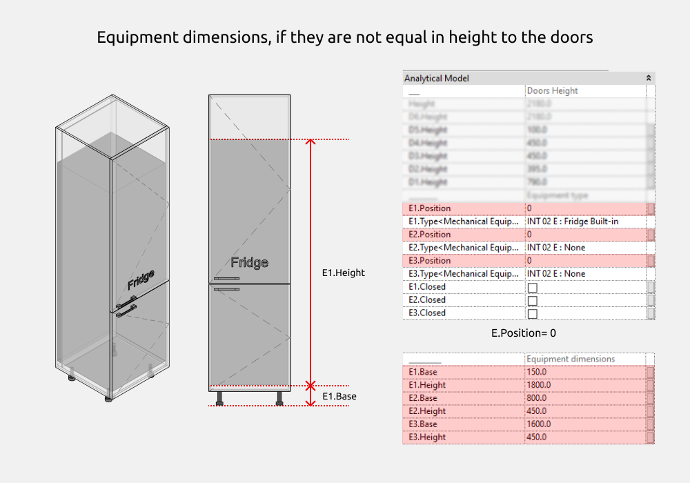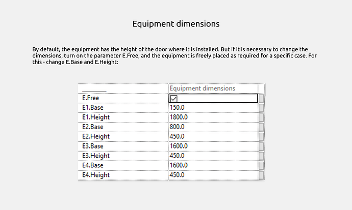By default, the equipment has the door height in which it is installed. But if you need to change the dimensions, then put the number 0 in the E.Position parameter and the equipment is freely placed as needed for a specific case. To do this, change E.Base and E.Height.