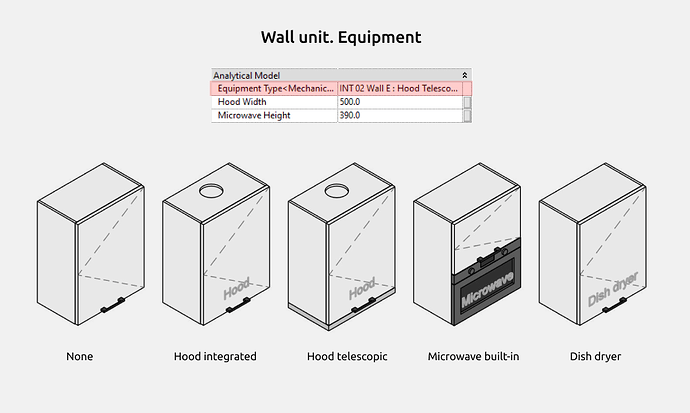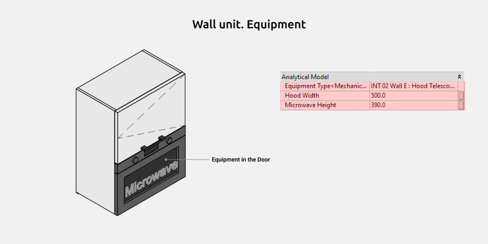 Equipment can be installed in place of the first/lower door. To do this, you need to select the equipment type from the drop-down list. Equipment type, Heading - INT 02 Wall E.
