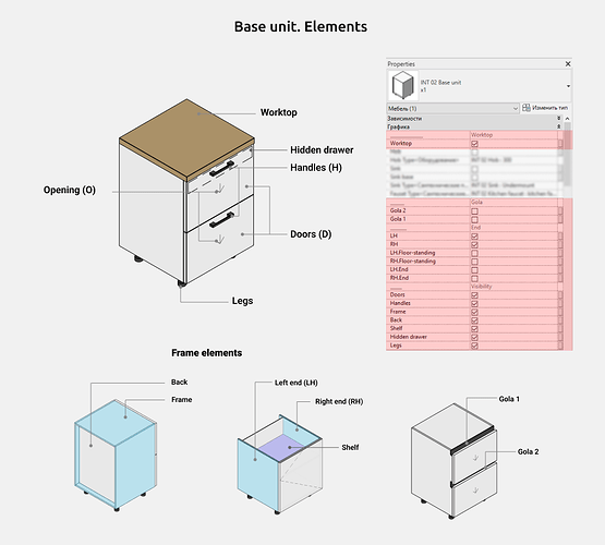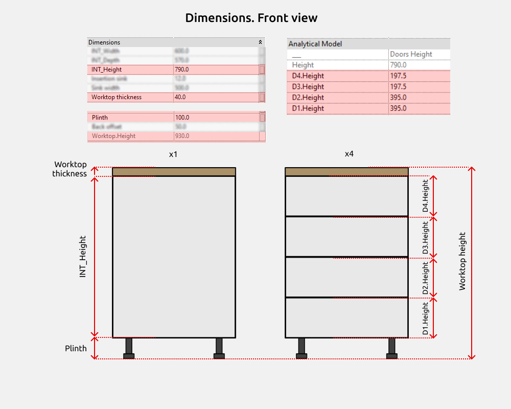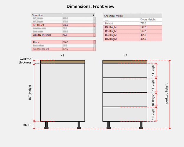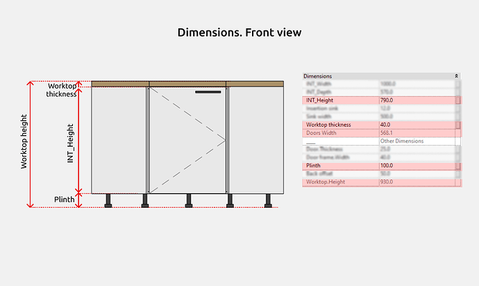 There are gray parameters that cannot be controlled. But they are needed to understand the size calculations. For example, Worktop height. The parameter summarizes all heights and shows the important end point of the worktop when Worktop is enabled. (see pictures)