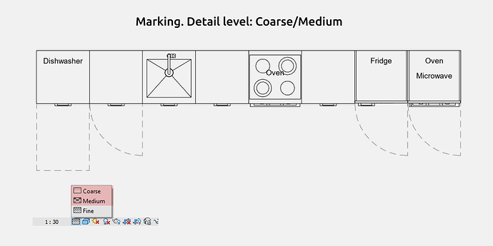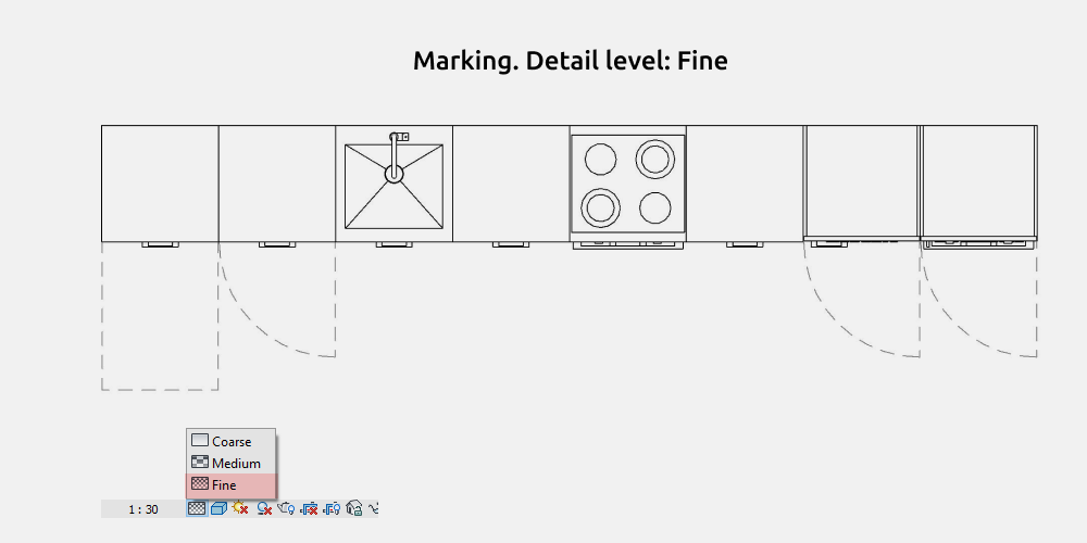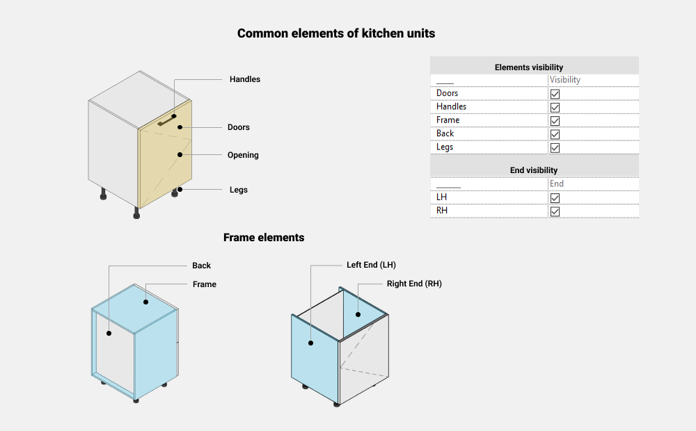 Using the families, you can create a kitchen according to exact dimensions and count the number of kitchen modules. Suitable for interior designers and architects. Families are not detailed enough for furniture makers.