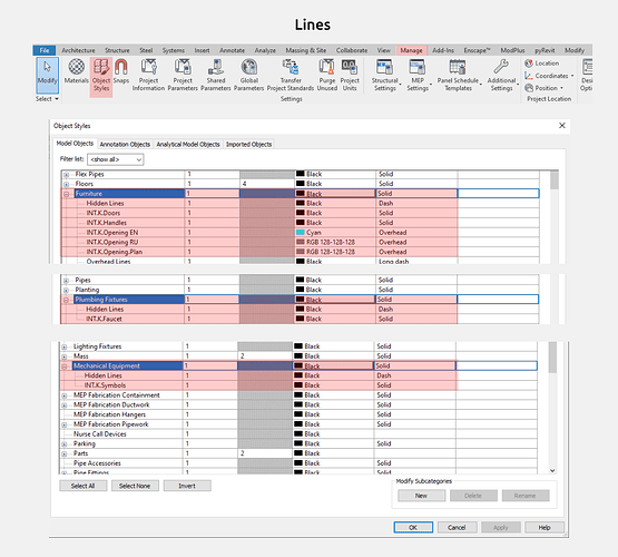 To change the color/weight/pattern of family lines, you need to go to Manage - Object Styles - Furniture/ Plumbing Fixtures/ Mechanical Equipment