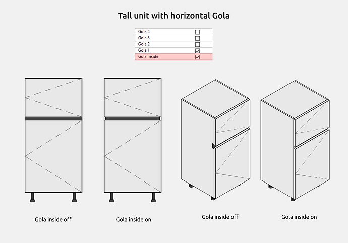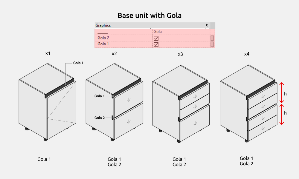 Gola can be placed on top of the frame, under the worktop - this is Gola 1. And the Gola 2 handle will be between the drawers in the center of the frame. The height of the frame can be higher/lower, but the height of the individual doors in this case changes equally, Gola 2 is always in the center.