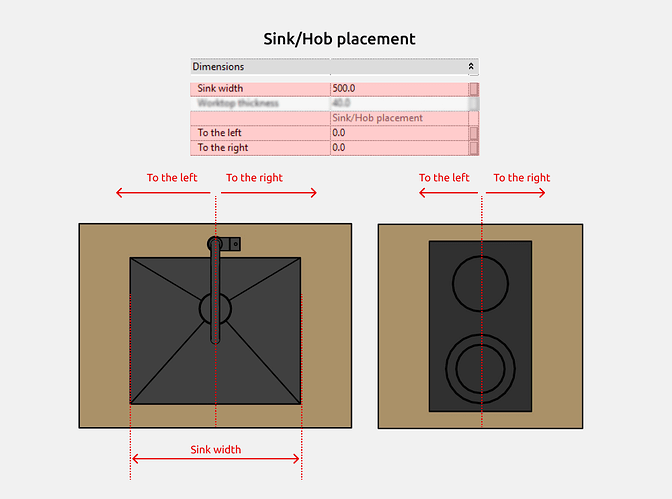 There is also a parameter for the sink - Sink width. If the configuration of these elements does not suit you, turn them off and place a separate family in the project.