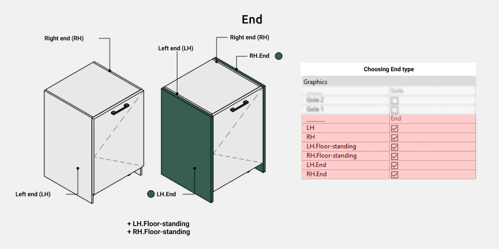 In units that are installed on the floor, additional parameters are added to the ends. These are: LH.Floor-standing, RH.Floor-standing (which allows the ends to be lowered to the floor) and LH.End, RH.End.