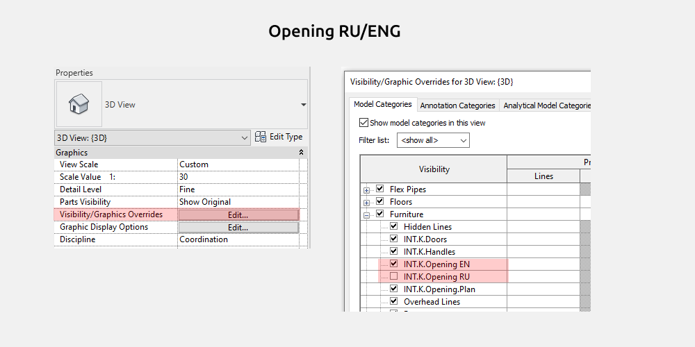 To turn on Opening RU or ENG, you need to go to View Visibility and then to Furniture.