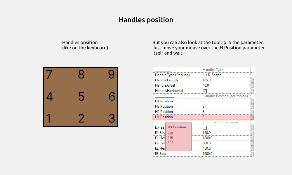 The placement of handles is not made by a drop-down list, but simply by numbers from 1 to 9. Visually, this is similar to the placement of numbers from a keyboard. You can also look at the tooltip in the H.Position parameter itself.