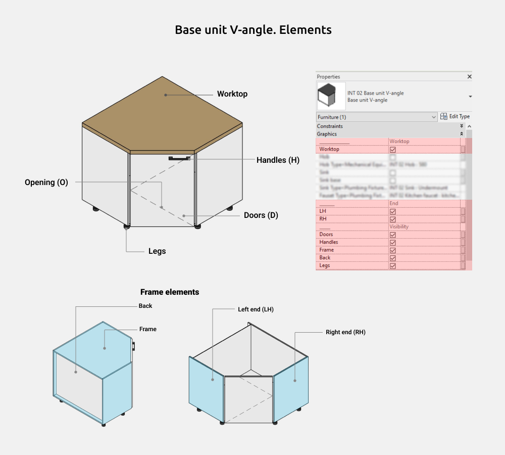 Base unit V-angle is used to build corner kitchen cabinets, which are placed on the floor and serve as a work surface for cooking. Unlike the Base unit, there is no equipment in the doors, and the number of doors is only 1.