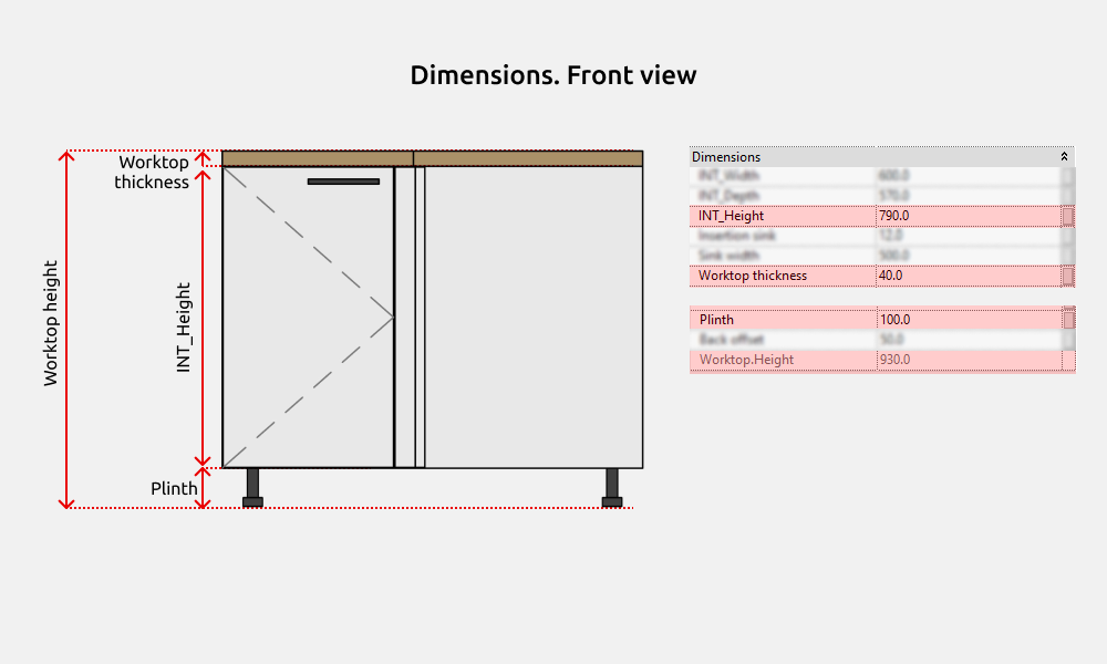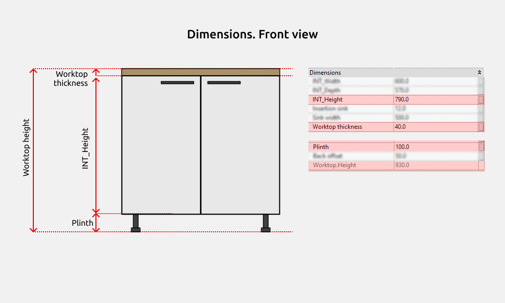 There are gray parameters that cannot be controlled. But they are needed to understand the size calculations. For example, Worktop height. The parameter summarizes all heights and shows the important end point of the worktop when Worktop is enabled. (see pictures)