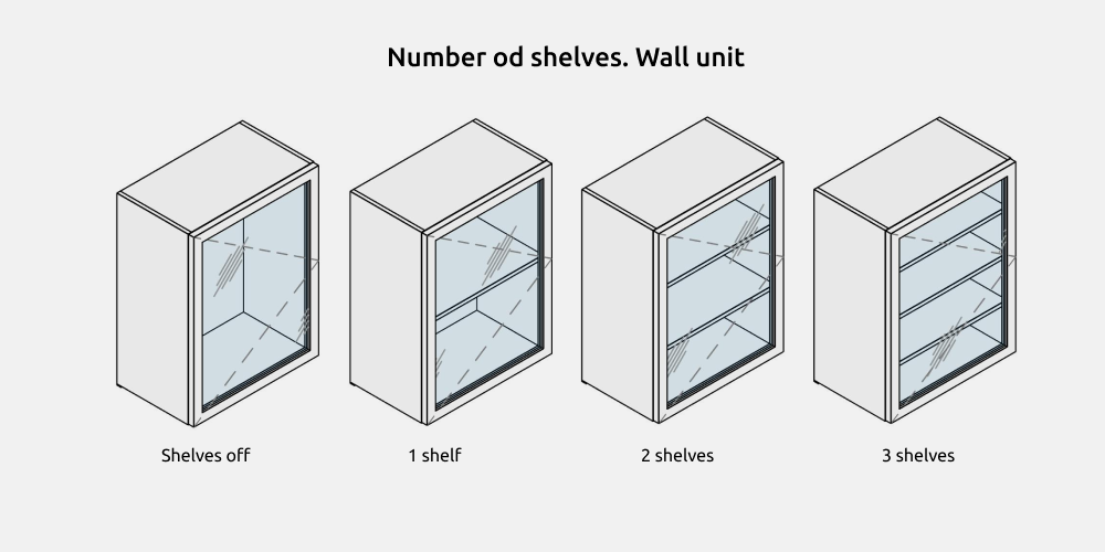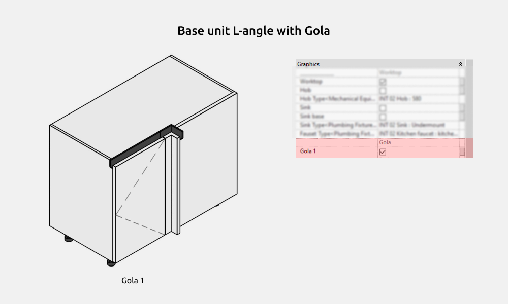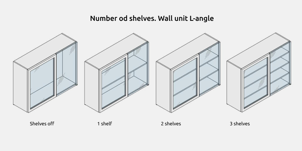 Base unit L-angle is used to build corner kitchen cabinets, which are placed on the floor and serve as a work surface for cooking. Unlike the Base unit, there is no equipment in the doors, and the number of doors is only 1.