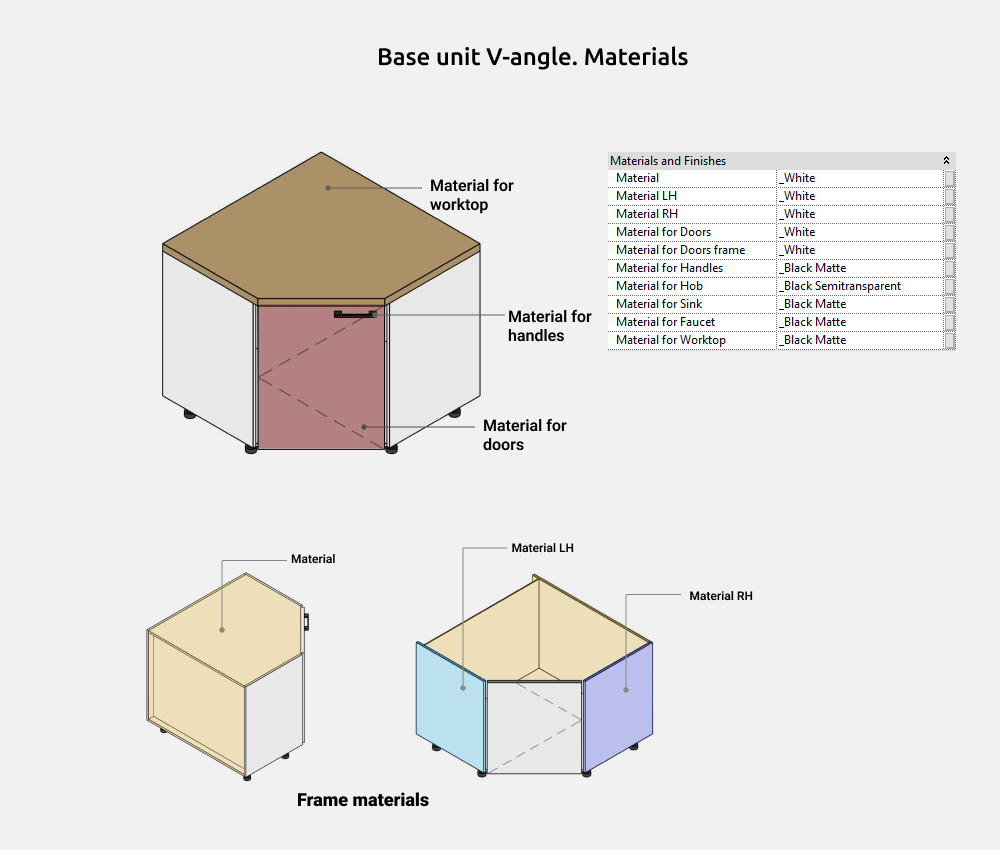 Base unit V-angle is used to build corner kitchen cabinets, which are placed on the floor and serve as a work surface for cooking. Unlike the Base unit, there is no equipment in the doors, and the number of doors is only 1.