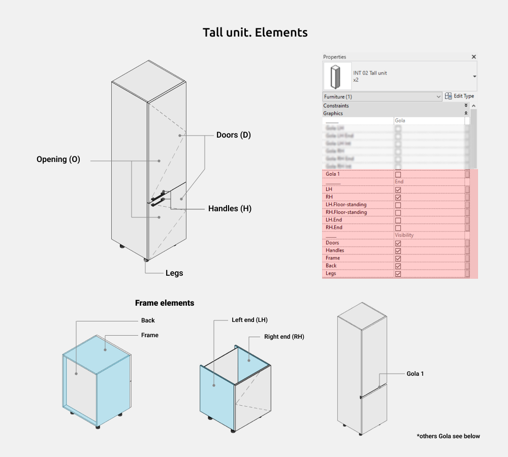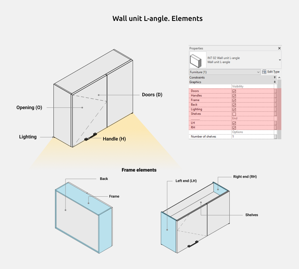 In units that are installed on the floor, additional parameters are added to the ends. These are: LH.Floor-standing, RH.Floor-standing (which allows the ends to be lowered to the floor) and LH.End, RH.End.