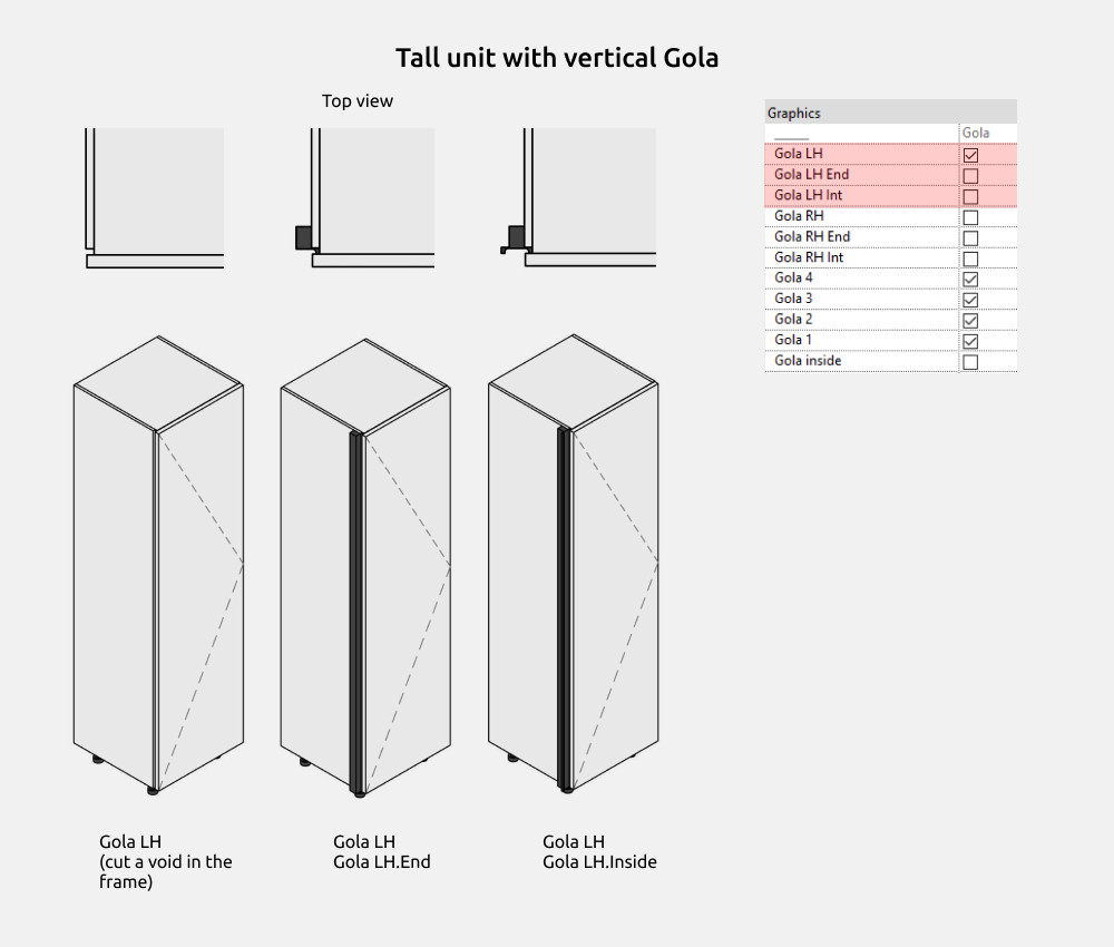 Gola handles in the Tall unit can be placed vertically on the left and right of the frame, and also horizontally between Doors - this is Gola 1, Gola 2, Gola 3, Gola 4.