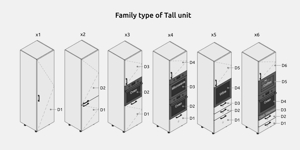 Tall unit is used to build floor-standing column cabinets for the kitchen. With or without built-in equipment.