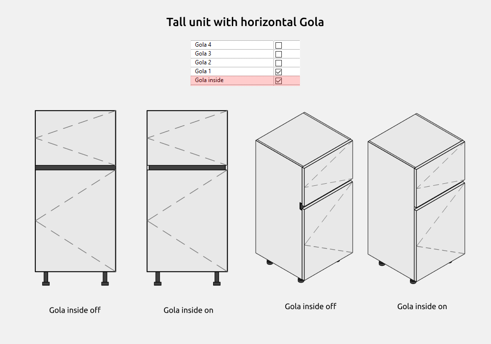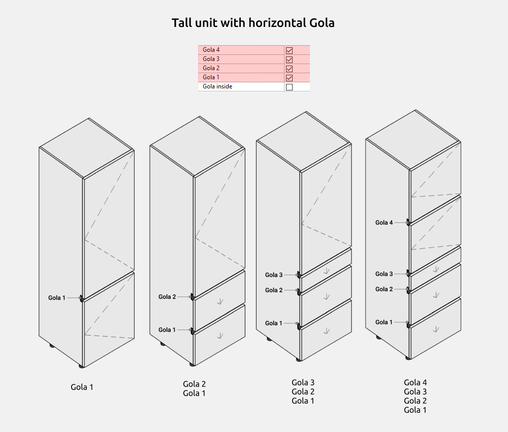Gola can be placed on top of the frame, under the worktop - this is Gola 1. And the Gola 2 handle will be between the drawers in the center of the frame. The height of the frame can be higher/lower, but the height of the individual doors in this case changes equally, Gola 2 is always in the center.