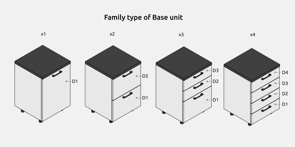 For example, family type x3 is selected, D1.Height and D2.Height will be changeable, and D3.Height is calculated based on the first two heights.