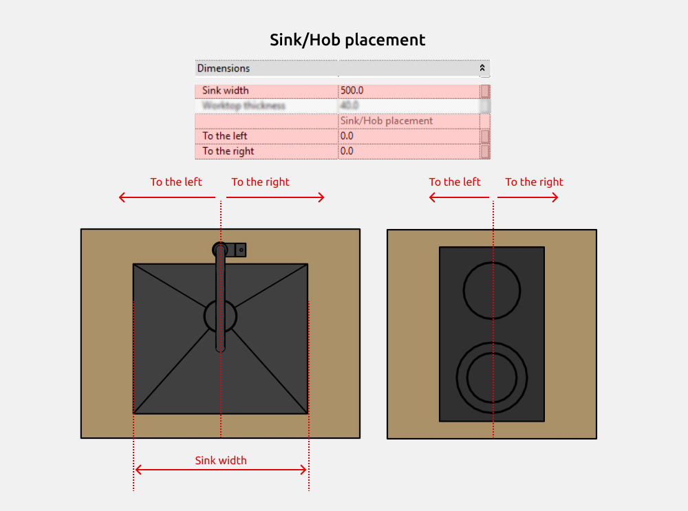 There is also a parameter for the sink - Sink width. If the configuration of these elements does not suit you, turn them off and place a separate family in the project.