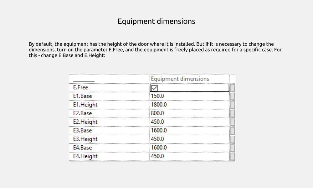 By default, the equipment has the door height in which it is installed. But if you need to change the dimensions, then put the number 0 in the E.Position parameter and the equipment is freely placed as needed for a specific case. To do this, change E.Base and E.Height.