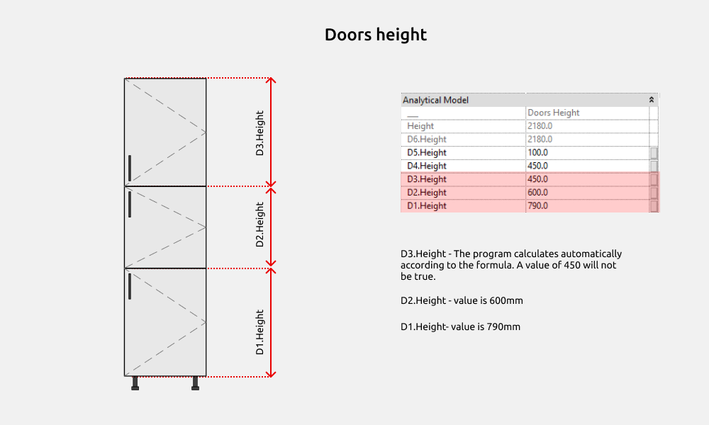 It is better to start building D.Height from the lower, first door. Because D.Height of the last, upper door does not work.