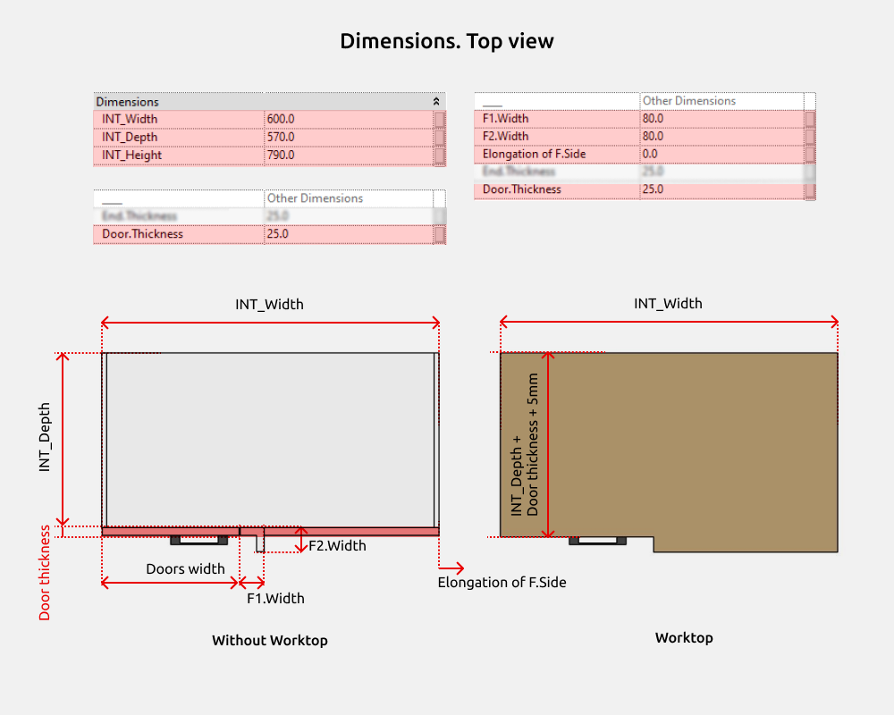 Worktop depth in the top view has a fixed value and consists of the dimensions: Depth + Door thickness + 5mm.