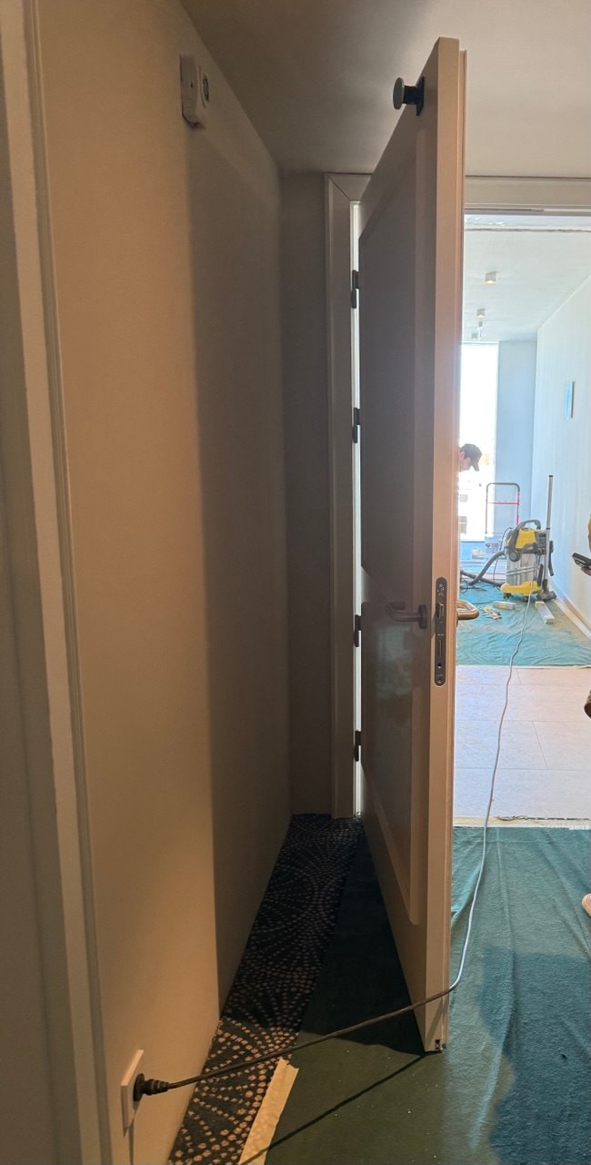 El ejemplo muestra una puerta cortafuegos en un hotel que tiene un aspecto visualmente limpio y no técnico, mientras que en realidad integra una cantidad significativa de herrajes y cuenta con clasificación de resistencia al fuego. Idealmente, estos elementos deberían considerarse tanto en el modelo 3D como en la especificación. Los componentes relevantes pueden incluir, por ejemplo, un retenedor electromagnético, bisagras adicionales y un sello de guillotina en la parte inferior de la hoja de la puerta.